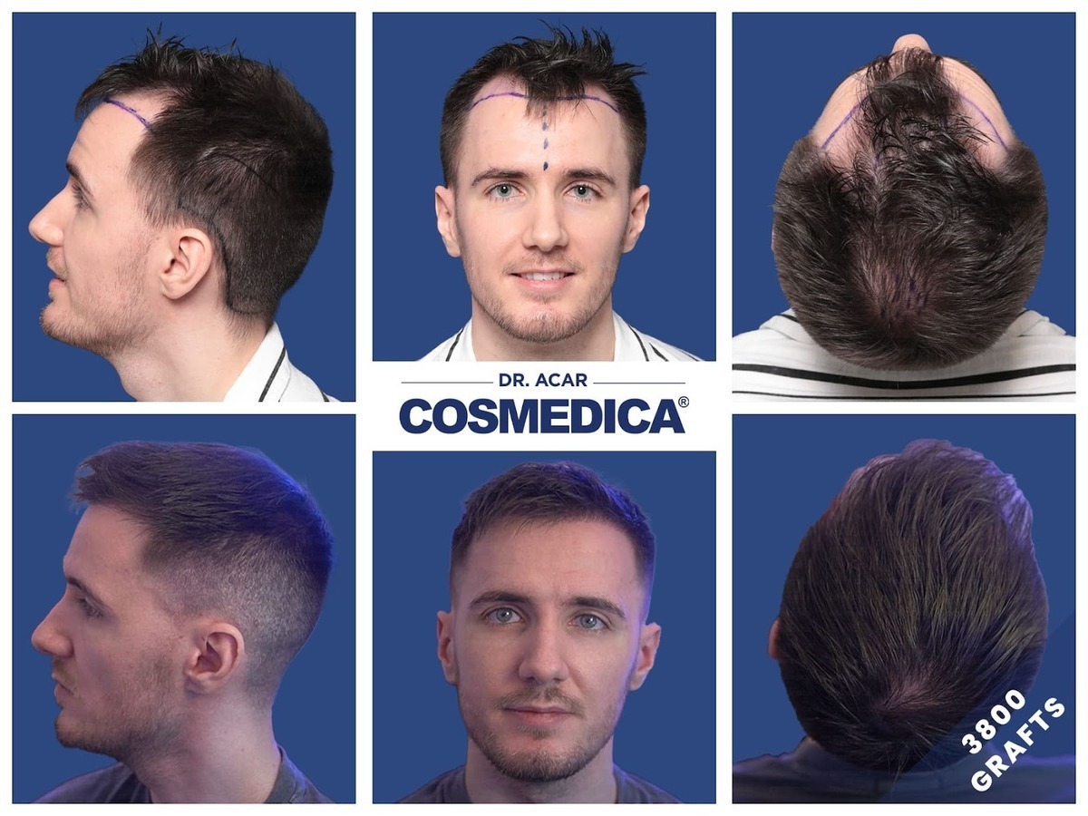 Foto del prima e dopo un trapianto di capelli che dimostrano il risultato efficace di una clinica come Cosmedica