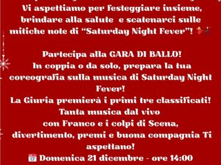 Tra i momenti più attesi della giornata ci sarà la gara di ballo, aperta a tutti: in coppia o da soli, i partecipanti potranno preparare la propria coreografia proprio sulle musiche di “Saturday Night Fever”. Una giuria premierà i primi tre classificati. Il pomeriggio sarà animato da musica dal vivo con Franco e i colpi di Scena, insieme a divertimento, premi e un clima di buona compagnia che accompagnerà l’intero evento.