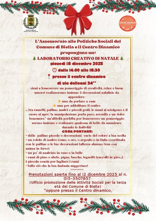 L’Assessorato alle Politiche Sociali del Comune di Biella e il Centro Dinamico organizzano un Laboratorio Creativo di Natale, in programma giovedì 18 dicembre 2025, dalle 14:00 alle 16:30, presso il Centro Dinamico di via Delleani 34.