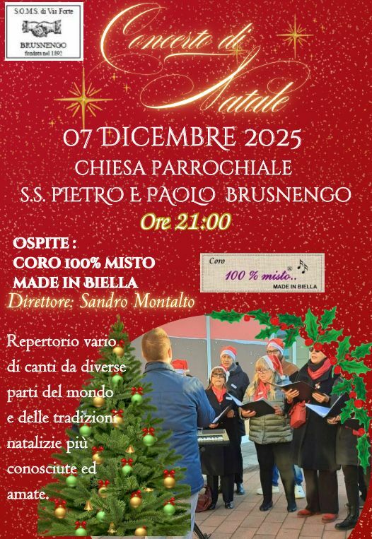 Si terrà domenica 7 dicembre 2025, alle 21, il tradizionale Concerto di Natale organizzato dalla S.O.M.S. di Via Forte – Brusnengo. L’appuntamento è fissato nella chiesa parrocchiale dei Santi Pietro e Paolo, dove il pubblico potrà assistere a una serata musicale dedicata alle atmosfere delle festività.
