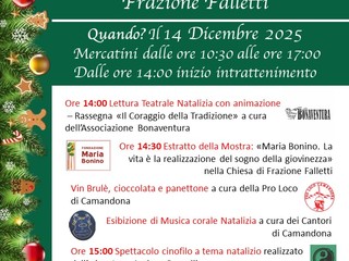 Il clou degli appuntamenti sarà nel pomeriggio, a partire dalle 14, con le attività di intrattenimento per i più piccoli: tra queste figura, ad esempio, la lettura teatrale animata, unita allo spettacolo cinofilo a tema natalizio senza dimenticare le leccornie preparate dalla Pro Loco di Camandona (vin brulé, cioccolata calda e panettone). Un ricco programma di eventi in grado di conquistare i gusti di tutta la famiglia e lasciare un buon ricordo da tramandare. In caso di maltempo i mercatini saranno annullati ma si svolgerà ugualmente alle 14 la lettura teatrale nella sede della Pro Loco.