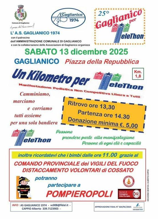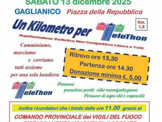 Gaglianico si prepara al momento clou della 25ª edizione di Gaglianico per Telethon. Sabato 13 dicembre, in Piazza della Repubblica, si terrà la manifestazione podistica non competitiva “Un Chilometro per Telethon”, un’occasione aperta a tutti per camminare, marciare o correre insieme a sostegno della ricerca sulle malattie genetiche rare. Il ritrovo è previsto alle 13:30, con partenza alle 14:30, e la donazione minima per partecipare è di 5 euro.