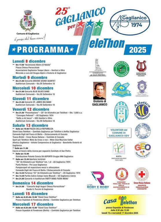 Domenica 14 alle 21 ci sarà un concerto degli auguri in chiesa con la Banda Puccini di Gaglianico. Gli eventi proseguiranno anche nei giorni successivi con lo Stand Casa Telethon, che sarà operativo presso l’Ospedale di Ponderano lunedì 15 e mercoledì 17 dicembre, per raccogliere ulteriori fondi e sensibilizzare la comunità sul valore della ricerca scientifica.