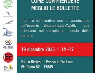 Venerdì 19 dicembre 2025, dalle ore 14 alle 17, a Ronco Biellese è in programma un incontro informativo dal titolo “Come comprendere meglio le bollette”, inserito nel percorso dedicato a digitalizzazione e sicurezza.
