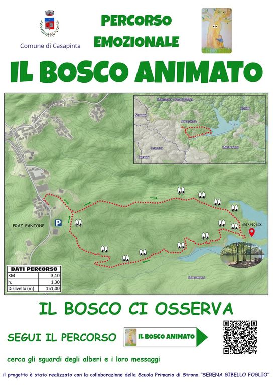Il percorso, lungo oltre 3 chilometri, con partenza dalla frazione Fantone, si sviluppa ad anello per un'ora e mezza di cammino immerso nel verde. È dotato di parcheggio e di aree attrezzate con tavoli da picnic e punti panoramici lungo il Lago delle Piane. Elementi che lo rendono accessibile e adatto a famiglie. Il progetto è ancora in fase di completamento ma molte delle installazioni previste sono già operative. Attualmente il bosco ospita 15 alberi “con gli occhi”, piccole postazioni pensate per creare sentimenti di empatia tra l'escursionista e l’ambiente naturale. Accanto a questi, sono presenti anche delle piante “parlanti” che offrono messaggi educativi: brevi riflessioni che il bosco “affida” a chi attraversa il sentiero con cartelli didattiche.