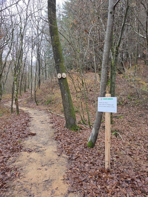 Il percorso, lungo oltre 3 chilometri, con partenza dalla frazione Fantone, si sviluppa ad anello per un'ora e mezza di cammino immerso nel verde. È dotato di parcheggio e di aree attrezzate con tavoli da picnic e punti panoramici lungo il Lago delle Piane. Elementi che lo rendono accessibile e adatto a famiglie. Il progetto è ancora in fase di completamento ma molte delle installazioni previste sono già operative. Attualmente il bosco ospita 15 alberi “con gli occhi”, piccole postazioni pensate per creare sentimenti di empatia tra l'escursionista e l’ambiente naturale. Accanto a questi, sono presenti anche delle piante “parlanti” che offrono messaggi educativi: brevi riflessioni che il bosco “affida” a chi attraversa il sentiero con cartelli didattiche.