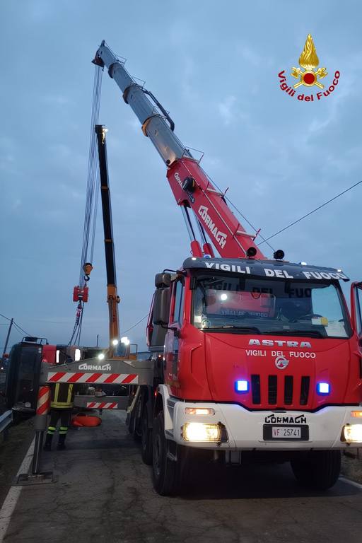 L'operazione congiunta tra l'autogrù dei Vigili del Fuoco e un'altra privata ha permesso di raddrizzare il mezzo pesante che è stato rimesso in sicurezza e rimosso. Presente sul posto la Polizia Locale.