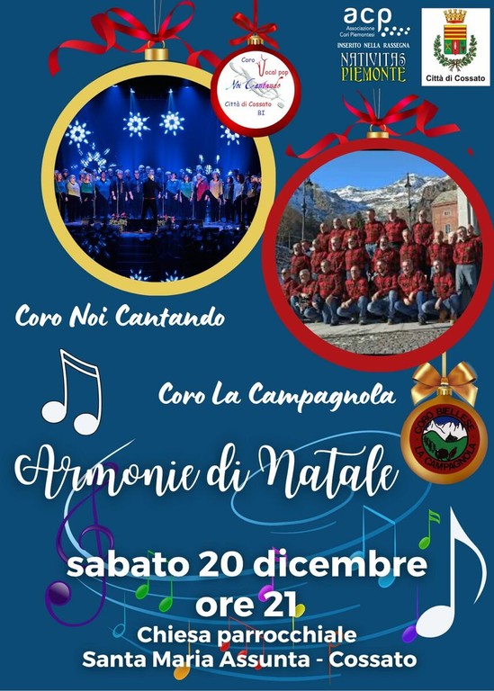 Il Natale è alle porte e, come di consueto, il Coro Noi Cantando ha il piacere di porgere gli auguri ai cossatesi e a tutti coloro che con affetto seguono il gruppo, con il concerto “Armonie di Natale”, con la direzione di Andrea Cracco, recentemente subentrato a Monica Magonara che lo affiancherà ancora per questa ultima rassegna del 2025.