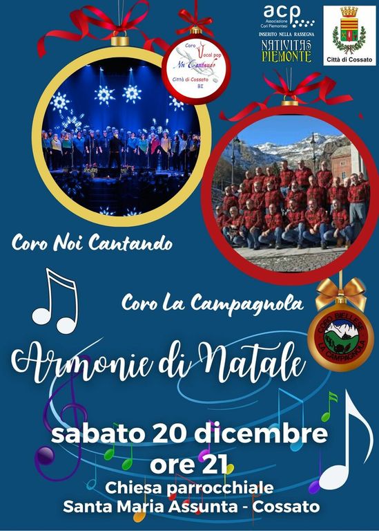 Il Natale è alle porte e, come di consueto, il Coro Noi Cantando ha il piacere di porgere gli auguri ai cossatesi e a tutti coloro che con affetto seguono il gruppo, con il concerto “Armonie di Natale”, con la direzione di Andrea Cracco, recentemente subentrato a Monica Magonara che lo affiancherà ancora per questa ultima rassegna del 2025.