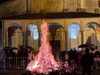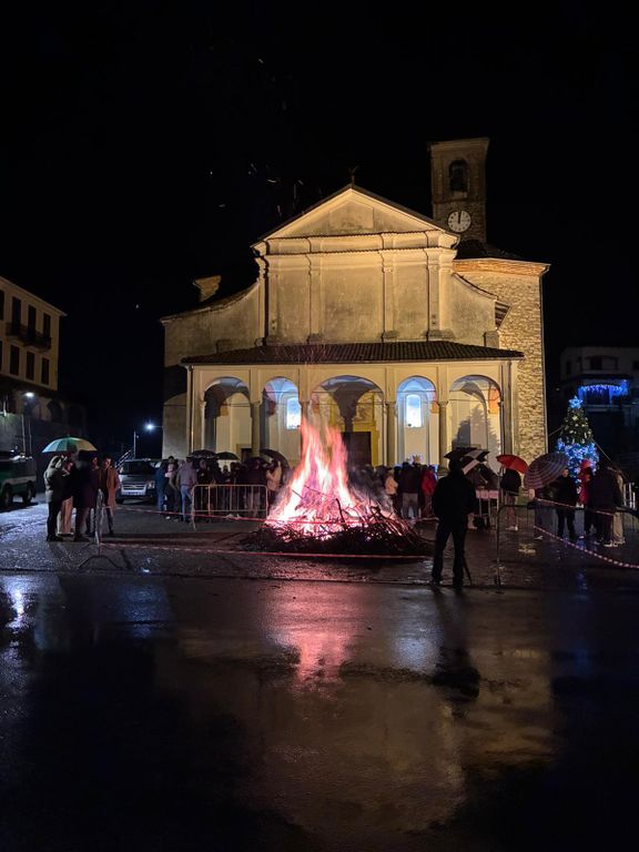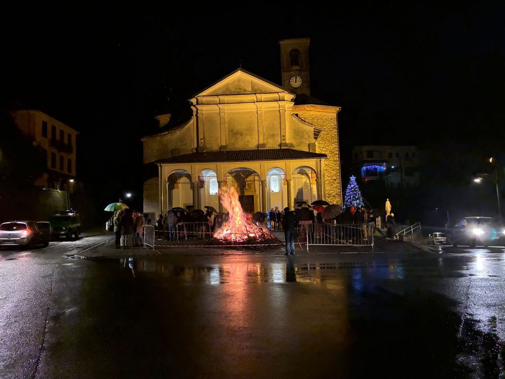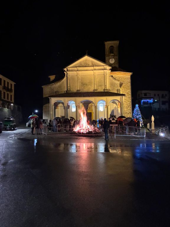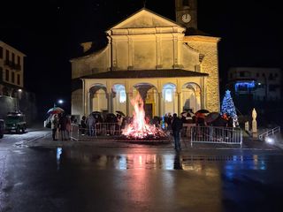 Nonostante il maltempo e le diffuse piogge in tutto il Biellese, a Strona si è deciso di accendere il tradizionale falò di Natale, all'esterno della chiesa parrocchiale, al termine della Santa Messa di mezzanotte.