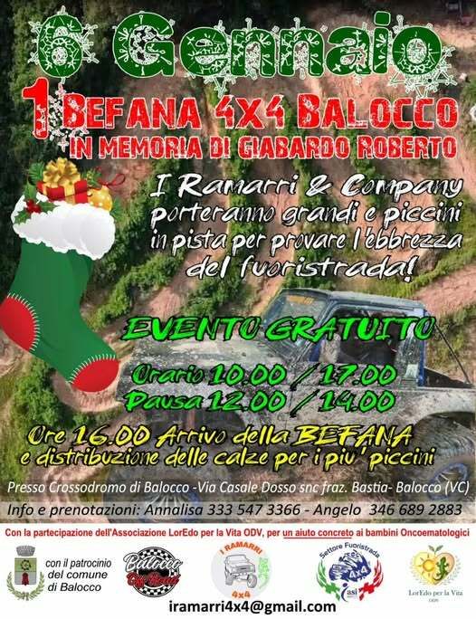 Una nuova collaborazione prende forma nel segno della passione per il fuoristrada e della memoria. I Ramarri 4x4, gruppo biellese, e Balocco Offroad uniscono le forze per la “1ª Befana 4x4 Balocco”, evento in programma lunedì 6 gennaio presso il crossodromo di Balocco, organizzato in memoria di Roberto Giabardo.