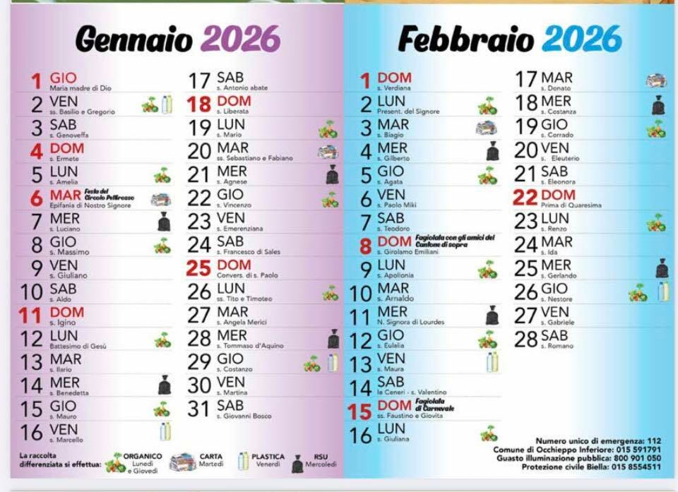 A Occhieppo Inferiore i calendari offerti dal Comune saranno consegnati ai cittadini verso la metà del mese di gennaio. In attesa della distribuzione ufficiale, l’amministrazione comunale ha reso disponibile una bozza del calendario per permettere a tutti di prenderne visione con anticipo, visto che gli stessi riportano i giorni di conferimento della raccolta dei rifiuti.