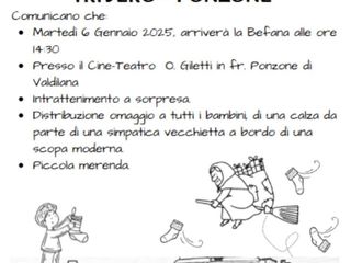 Sarà un pomeriggio di festa dedicato ai più piccoli quello in programma a Ponzone-Valdilana in occasione dell’Epifania. I Vigili del Fuoco Volontari di Trivero – Ponzone annunciano l’arrivo della Befana martedì 6 gennaio 2025, a partire dalle ore 14.30, presso il Cine-Teatro O. Giletti.