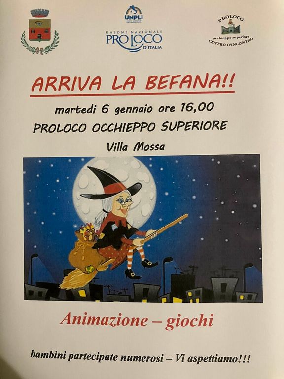 Occhieppo Superiore si prepara a vivere un pomeriggio di festa dedicato ai più piccoli. Oggi, martedì 6 gennaio, a partire dalle ore 16, presso Villa Mossa, è in programma l’evento “Arriva la Befana!!” promosso dalla Pro Loco di Occhieppo Superiore.