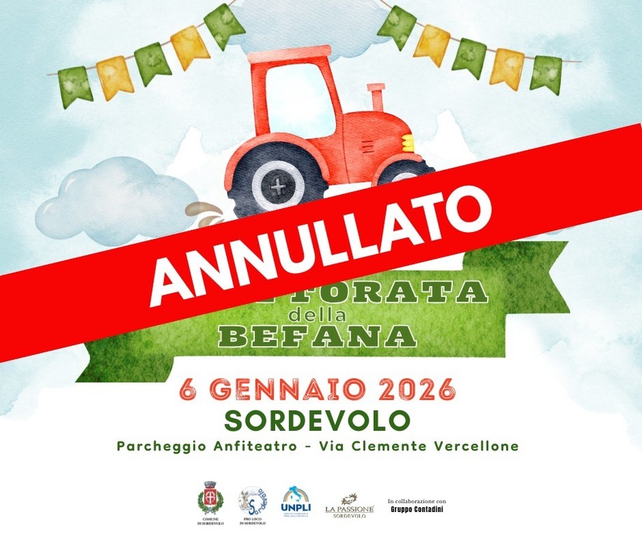 Il Comune di Sordevolo comunica che l'evento di oggi "Trattorata della Befana" è stato annullato "per rispetto e vicinanza in un momento di lutto".
