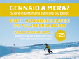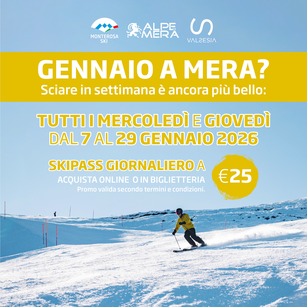 Nel mese di gennaio, Alpe di Mera propone un’opportunità dedicata a chi desidera vivere la montagna lontano dall’affollamento del fine settimana. Tutti i mercoledì e giovedì, dal 7 al 29 gennaio 2026, sarà possibile sciare usufruendo di uno skipass giornaliero al prezzo speciale di 25 euro, acquistabile online o direttamente in biglietteria.