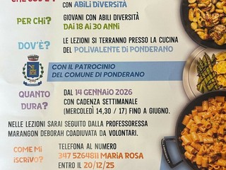"Attraverso le attività pratiche in cucina - spiega il sindaco Roberto Locca -, i partecipanti avranno l'opportunità di sviluppare abilità tecniche e creative ma anche di socializzare e vincere le proprie insicurezze. L'amministrazione comunale di Ponderano è fermamente convinta dell'importanza di creare occasioni di integrazione e crescita personale per tutte le persone, indipendentemente dalle loro difficoltà".