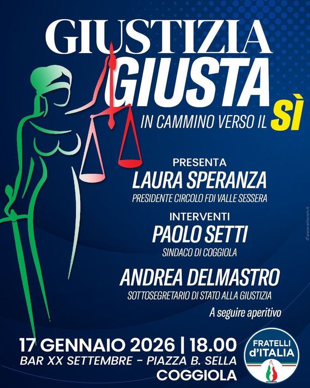 Si svolgerà sabato 17 gennaio, alle 18, a Coggiola, presso il Bar XX Settembre, in piazza Sella, l’incontro pubblico “Giustizia Giusta – In cammino verso il Sì”, promosso da Fratelli d’Italia e dedicato alla riforma della giustizia portata avanti dal Governo guidato da Giorgia Meloni. L’iniziativa si inserisce nel percorso di informazione avviato da FdI in vista del referendum confermativo sulla riforma costituzionale della giustizia, con l’obiettivo di spiegare ai cittadini le ragioni del Sì.