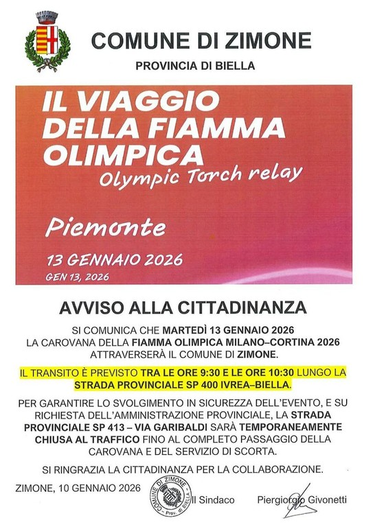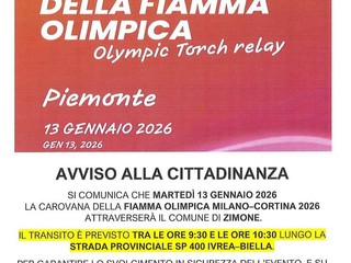 Oggi, martedì 13 gennaio, il Comune di Zimone sarà interessato dal passaggio della carovana della Fiamma Olimpica Milano-Cortina 2026, nell’ambito del "Viaggio della Fiamma Olimpica in Piemonte".