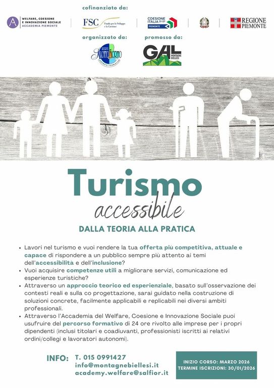 La proposta formativa si inserisce all’interno delle attività dell’Accademia del Welfare, Coesione e Innovazione Sociale ed è organizzata con il supporto del GAL Montagne Biellesi, con l’avvio previsto a marzo 2026. Le iscrizioni sono aperte fino al 30 gennaio.
