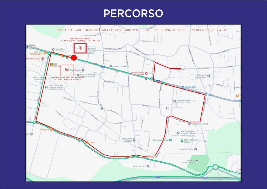 La giornata proseguirà alle ore 12:30 con il pranzo sociale, servito da “Cà ’d Gamba”, presso la sede dell’Associazione Carrettieri di Vigliano Biellese, in Via per Chiavazza 32. Le adesioni al pranzo dovranno pervenire entro mercoledì 21 gennaio 2026 contattando i referenti indicati dal Comitato organizzatore: Gugliotta Alessandro – Tel. 015 811516; Gugliotta Federico – Cell. 335 5608672; Brondani Igor – Cell. 328 6766994; Lanari Yoselito – Cell. 335 7815944; Merlin Sergio – Tel. 015 511309; Merlin Orietta – Cell. 339 8019306; Chiocchetti Filippo – Cell. 335 7043639.