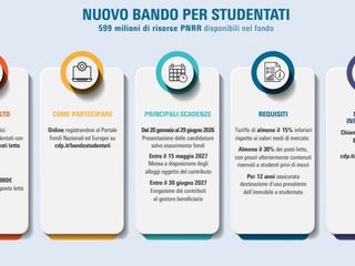 ROMA (ITALPRESS) - Cassa Depositi e Prestiti ha pubblicato il nuovo Bando per la messa a disposizione di nuovi posti letto per studenti, in base a una convenzione siglata con il Ministero dell'Università e della Ricerca e in linea con quanto previsto dalla revisione del Pnrr. Al Fondo è assegnata una dotazione complessiva di 599 milioni di euro. L'iniziativa ha l'obiettivo di raggiungere entro il 15 maggio 2027 la soglia di 60 mila alloggi considerando sia il Bando lanciato da CDP sia quello del Ministero.Per accedere ai contributi finanziari, le candidature, aperte a soggetti sia pubblici sia privati, potranno essere presentate attraverso il Servizio Telematico dedicato entro il 29 giugno 2026. A seguito della messa a disposizione degli studentati, CDP potrà erogare ai gestori delle strutture un contributo economico a fondo perduto entro il 30 giugno 2027. Ciascuna richiesta di ammissione dovrà prevedere almeno 18 nuovi posti letto per residenza e gli immobili dovranno trovarsi nel territorio di capoluoghi di provincia sede di ateneo o aree limitrofe. I gestori delle strutture saranno tenuti a garantire tariffe di almeno il 15% inferiori rispetto ai valori medi di mercato e riservare almeno il 30% dei posti letto, con prezzi ulteriormente contenuti, agli studenti fuori sede capaci e meritevoli anche se privi di mezzi. Inoltre, dovrà essere assicurata per 12 anni la destinazione d'uso prevalente degli immobili ad alloggio o residenza per studenti universitari.L'importo del contributo potrà essere fino a un massimo di circa 20 mila euro per ogni posto letto. -foto ufficio stampa Cdp - (ITALPRESS).