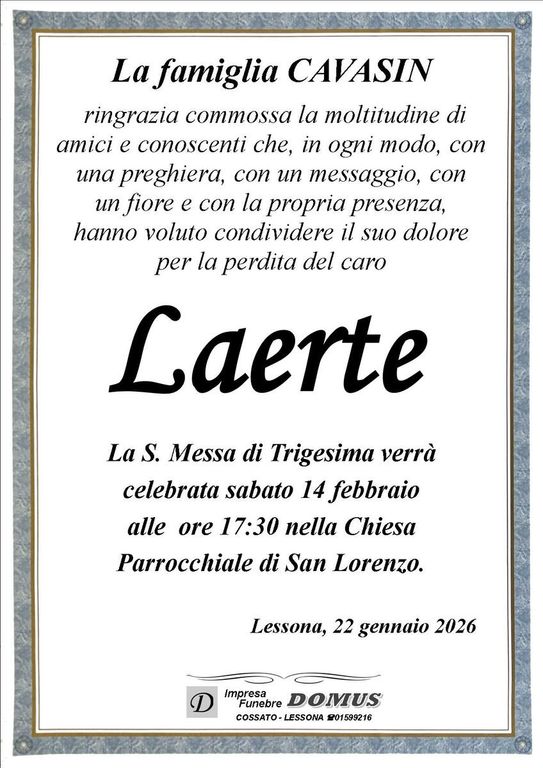 Laerte Cavasin, ringraziamento
