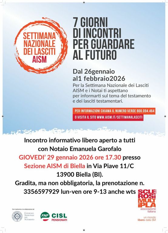 Anche la Sezione Provinciale AISM di Biella partecipa alla Settimana Nazionale dei Lasciti AISM, realizzata in collaborazione e con il patrocinio del Consiglio Nazionale del Notariato e con il sostegno della Federazione Nazionale Pensionati Cisl, con un incontro informativo che si terrà giovedì 29/1/26 alle ore 17.30 nella Sezione AISM di BIELLA in Via Piave 11/C. All’incontro interverranno il Presidente Paolo Trenta il notaio Emanuela Garofalo.