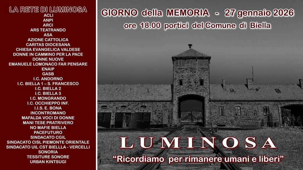Per celebrare la ricorrenza del "GIORNO DELLA MEMORIA" Luminosa organizza una commemorazione Martedì 27 gennaio 2026 alle ore 18 sotto I PORTICI del COMUNE di BIELLA (fronte Battistero).