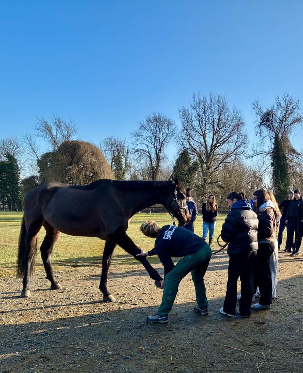 La giornata è iniziata in club house dove l’istruttore di III livello FISE Giorgio Zanetta ha rivisto con gli studenti gli argomenti trattati nelle precedenti lezioni ed in particolare la struttura anatomica del cavallo, le caratteristiche dell’apparato scheletrico e muscolare. Questa introduzione è servita per presentare l’intervento di Alessio Gazzetto, osteopata equino e atleta, invitato proprio per approfondire gli argomenti in programma e completare la formazione degli studenti dell’indirizzo sportivo. L'osteopata animale è infatti un professionista specializzato nel trattamento manuale di disturbi di postura, derivati da disfunzioni muscoloscheletriche e viscerali, negli animali; utilizza tecniche non invasive per migliorare la mobilità, alleviare dolori e favorire il benessere generale, intervenendo su squilibri strutturali o funzionali del corpo.