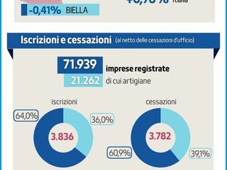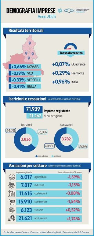 In particolare nel periodo di riferimento si contano 3.836 iscrizioni e 3.782 cessazioni (al netto delle 338 cancellazioni d’ufficio) nei territori di Biella, Novara, Verbano Cusio Ossola e Vercelli, con un totale di 71.939 imprese registrate al 31 dicembre 2025.