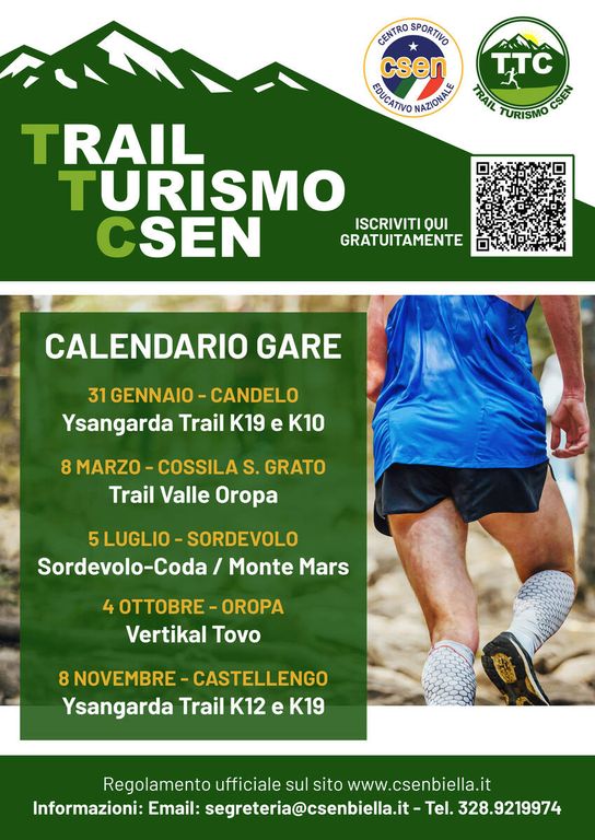 Si inaugura sabato 31 gennaio il circuito TTC (“Trail Turismo Csen”) con il primo appuntamento di due gare non competitive, che si terranno in contemporanea a Candelo: la Ysangarda Night Trail K10 e la Ysangarda Night Trail K19. Per rientrare tra i finisher del circuito sarà sufficiente completarne una delle due a scelta.