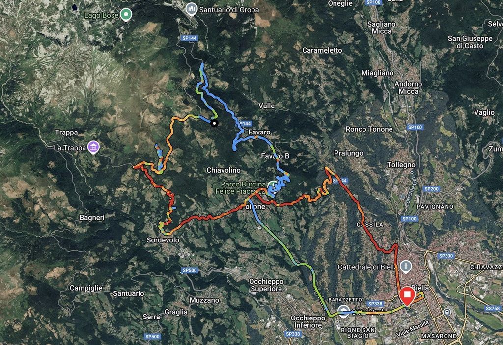 Allenamento piuttosto lineare in Valle Oropa e Muanda. Avvicinamento passando dalla Burcina, quindi Favaro, sentiero del trenino, Oropa Bagni e Tracciolino.