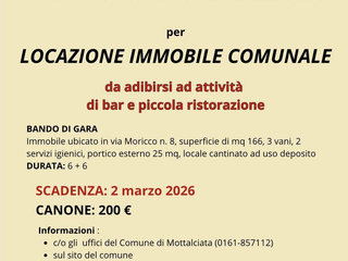 Il Comune di Mottalciata ha indetto un bando di gara per la locazione di un immobile comunale da adibire ad attività di bar e piccola ristorazione.