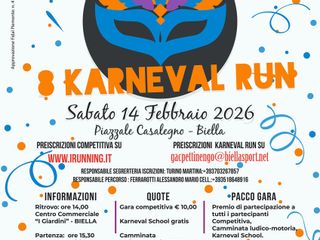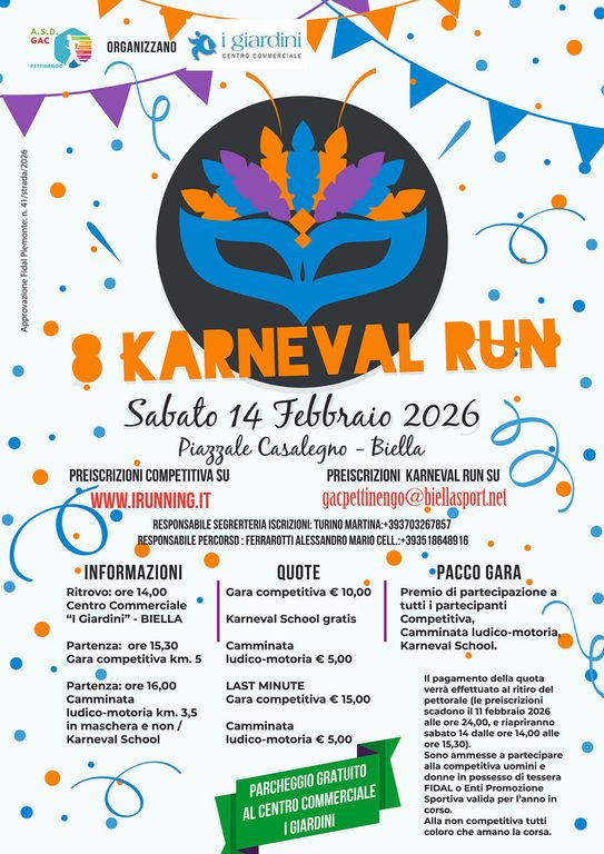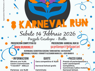 Sabato pomeriggio Biella si prepara ad accogliere una delle manifestazioni podistiche più originali dell’anno: torna la Karneval Run, la corsa che unisce agonismo, divertimento e spirito carnevalesco. Giunto all'8ª edizione, l'evento organizzato dal GAC Pettinengo in collaborazione con il Centro Commerciale I Giardini promette ancora una volta di trasformare lo sport in una vera festa per tutti.