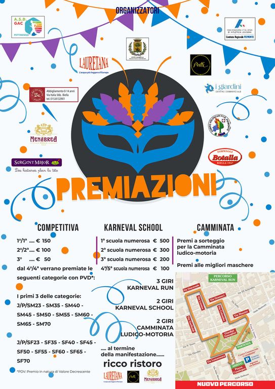 L’edizione 2026 presenta un percorso quasi completamente rinnovato ma sempre nel cuore di Biella: 4,5 chilometri per la gara competitiva (record azzerati quindi), pensata per chi ama mettersi alla prova e inseguire il cronometro; 3 chilometri per la camminata ludico-motoria e per la Karneval School, dedicata alle scuole.