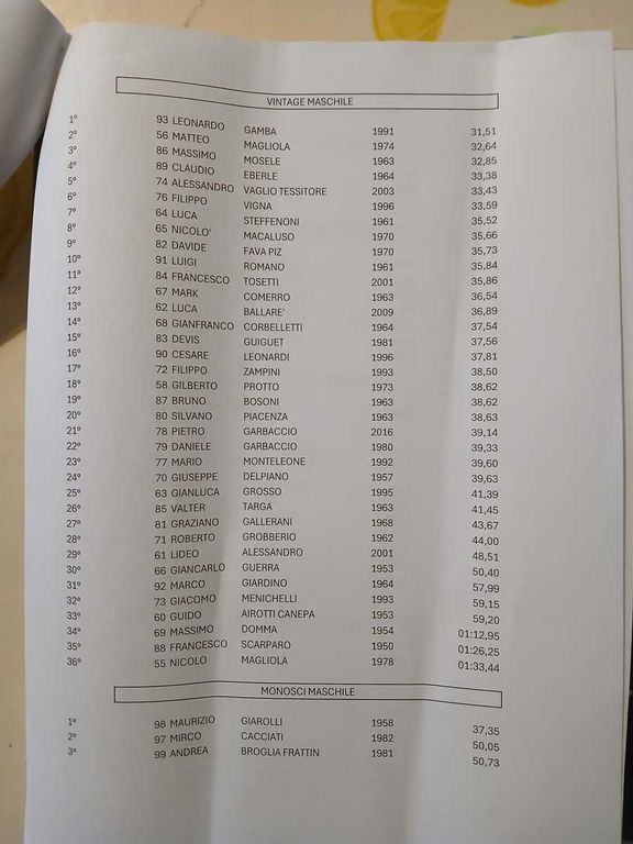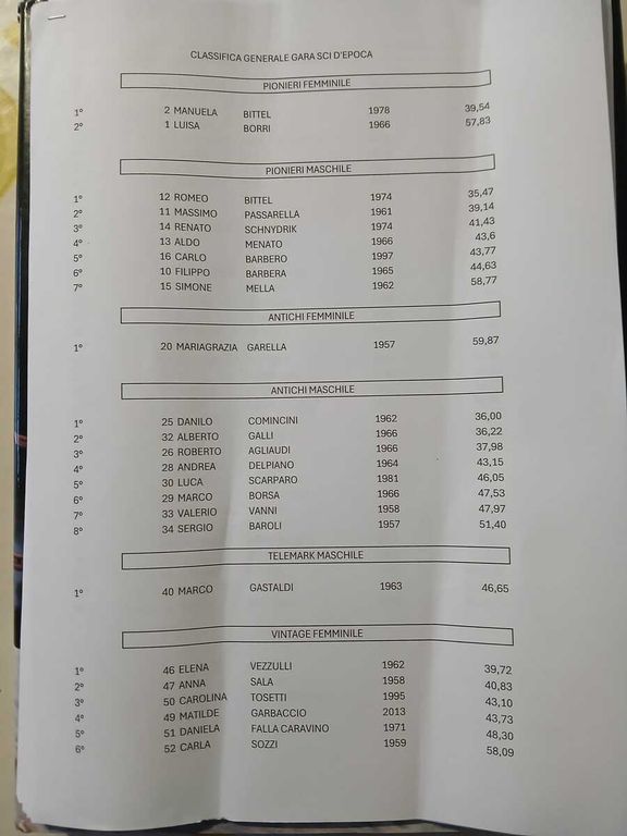 Complice la bella giornata di sole, ben 71 sportivi hanno preso parte alla rievocazione, arrivando da molte regioni d'Italia, come Liguria, Lombardia, Marche, Toscana, Trentino e Veneto, oltre dalla vicina Svizzera (con 4 rappresentanti). La gara, inoltre, ha visto come ospite d'onore Piero Gros, oro olimpico nello slalom, omaggiato con una targa realizzata dall'artista (e sciatore) biellese Paolo Barichello. 5 le categorie presenti, con una grande novità: il monosci, molto in voga negli anni ’80.