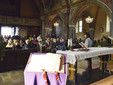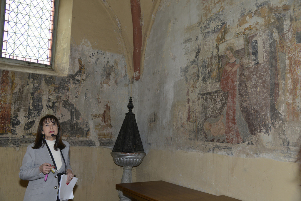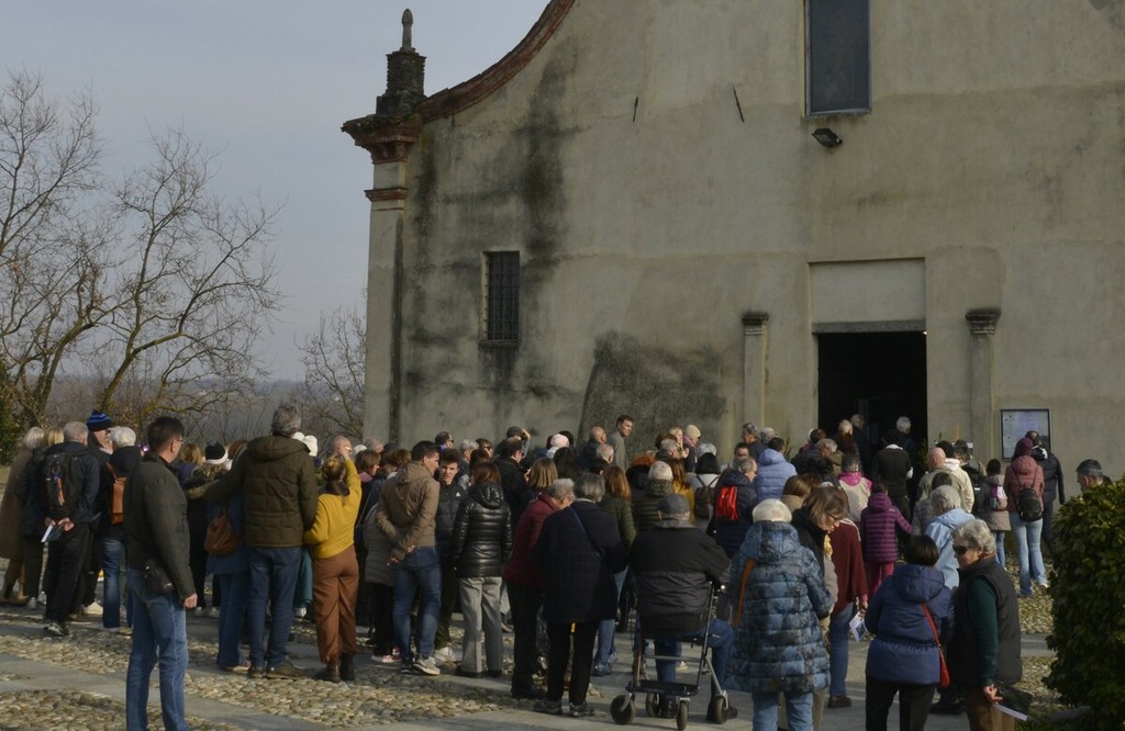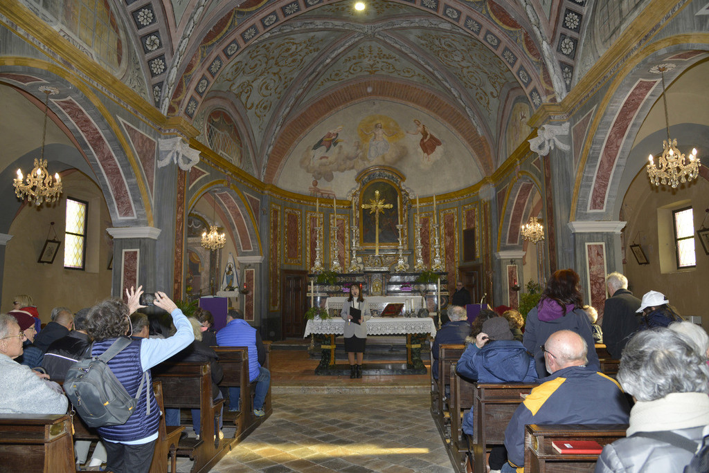 In apertura agli intervenuti è stato fatto omaggio di una cartolina recante da un lato una raffigurazione dello stemma Avogadro di Cerrione nelle sue fasce di rosso e di oro e dall’altro una mappa dell’itinerario proposto. Questo si è sviluppato, con una conferenza itinerante della Ghiraldello, a partire dalla chiesa parrocchiale che come impianto risale al XIV-XV secolo. All’interno è stato possibile visionare molti beni storico-artistici, tra i quali gli affreschi della cappella che ora funge da battistero, l’altare di San Giacomo, quello della Madonna del Rosario, nonché le due sacrestie che, restaurate negli anni 2006-2007, hanno permesso il recupero dell’antica decorazione. In una di queste sacrestie ha suscitato molto interesse l’infilata dipinta di ritratti di sacerdoti che ressero la parrocchia cerrionese, alcuni dei quali appartennero proprio alla casata Avogadro. Anche il catino absidale sottoposto a restauro ha fatto rinvenire sotto una posteriore decorazione notevoli dipinti che sono stati illustrati dalla dottoressa sia nel significato sia nell’artefice da lei identificato in Boniforte Oldoni qui attivo nel 1573.