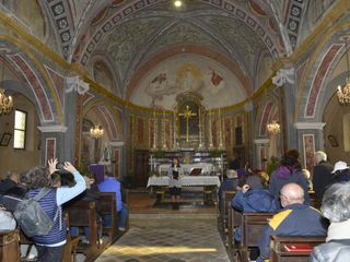 In apertura agli intervenuti è stato fatto omaggio di una cartolina recante da un lato una raffigurazione dello stemma Avogadro di Cerrione nelle sue fasce di rosso e di oro e dall’altro una mappa dell’itinerario proposto. Questo si è sviluppato, con una conferenza itinerante della Ghiraldello, a partire dalla chiesa parrocchiale che come impianto risale al XIV-XV secolo. All’interno è stato possibile visionare molti beni storico-artistici, tra i quali gli affreschi della cappella che ora funge da battistero, l’altare di San Giacomo, quello della Madonna del Rosario, nonché le due sacrestie che, restaurate negli anni 2006-2007, hanno permesso il recupero dell’antica decorazione. In una di queste sacrestie ha suscitato molto interesse l’infilata dipinta di ritratti di sacerdoti che ressero la parrocchia cerrionese, alcuni dei quali appartennero proprio alla casata Avogadro. Anche il catino absidale sottoposto a restauro ha fatto rinvenire sotto una posteriore decorazione notevoli dipinti che sono stati illustrati dalla dottoressa sia nel significato sia nell’artefice da lei identificato in Boniforte Oldoni qui attivo nel 1573.