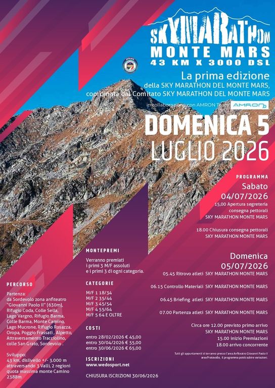 La “Monte Mars” partirà da Sordevolo alle ore 7:00 e si svolgerà il 5 luglio 2026, in contemporanea all’annuale competizione “Sordevolo-Coda”. Entrambe le gare fanno parte del circuito “Trail Turismo Csen”, a cui è possibile iscriversi gratuitamente tramite il sito ufficiale di Csen Biella (https://lnx.csenbiella.it/).