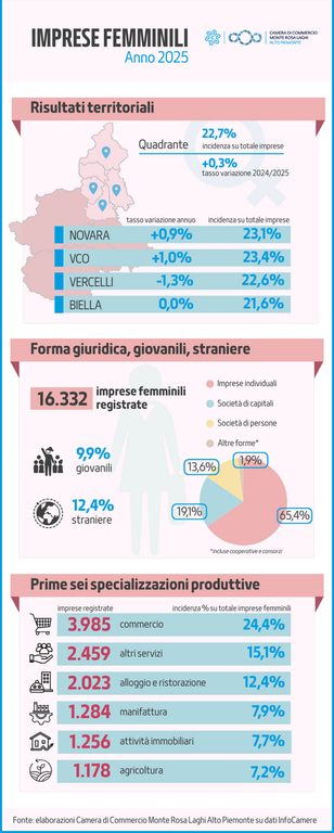 Nel corso del 2025 le imprenditrici dell’Alto Piemonte hanno dato vita a 1.076 nuove attività, chiudendone 1.051 (al netto di 31 cancellazioni d’ufficio): il bilancio demografico è risultato, pertanto, di sostanziale tenuta (+11 unità), traducendosi in un tasso di variazione del +0,3%, non lontano da quello registrato dall’intero sistema imprenditoriale dei quattro territori (+0,07%). Le imprese a conduzione femminile hanno inoltre espresso una maggiore dinamicità in riferimento alla componente giovanile e a quella straniera, sebbene su numeri assoluti contenuti, registrando rispettivamente 376 e 228 nuove iscrizioni contro 143 e 147 cessazioni. Per quanto riguarda le singole aree territoriali, nel VCO lo stock delle imprese registrate (calcolato al netto delle cessazioni d’ufficio) evidenzia una lieve crescita rispetto al 2024 (+1%), così come a Novara (+0,9%), mentre Biella si attesta alla stabilità (0,0%) e Vercelli registra, invece, una flessione del -1,3%.