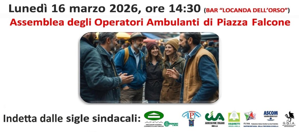 Nel frattempo la categoria si prepara a un momento di confronto diretto: lunedì 16 marzo alle 14,30 presso la Locanda dell'Orso verrà infatti convocata un’assemblea generale degli ambulanti, durante la quale si discuterà del progetto presentato dal Comune per lo spostamento del mercato nell’area attorno ai Giardini Zumaglini. Firmatari della richiesta: ANVA Confesercenti, APA Provincia di Biella, Agricoltori Italiani Biella, Coldiretti Biella Vercelli, Fiva Ascom, Goia.