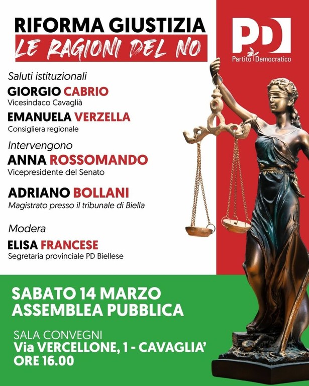Sabato 14 marzo alle ore 16.00, presso la Sala Convegni di via Vercellone 1 a Cavaglià, si terrà l’assemblea pubblica “Riforma della giustizia – Le ragioni del No”, un incontro promosso dal Partito Democratico biellese per discutere nel merito della proposta di riforma e delle sue implicazioni per l’equilibrio dei poteri, l’autonomia della magistratura e il funzionamento del sistema giudiziario.