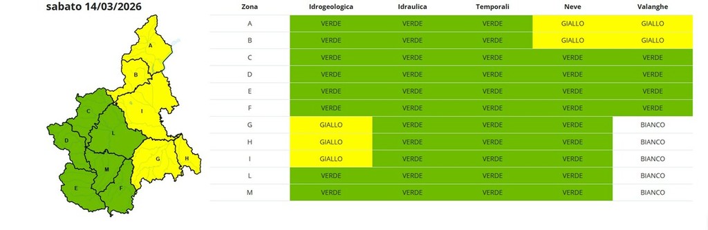 Arpa Piemonte ha emesso un bollettino di allerta gialla valido per sabato 14 marzo, che interessa anche il territorio di Biella. L’allerta, nelle nostre zone, riguarda neve e valanghe, mentre restano su livello verde i parametri relativi a rischio idrogeologico, idraulico e temporali.