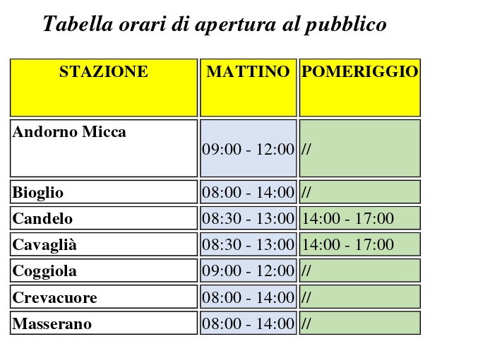Al fine di incrementare ulteriormente la proiezione dei servizi esterni sul territorio, garantendo una presenza sempre più capillare e dinamica a tutela della sicurezza dei cittadini, il Comando Provinciale Carabinieri di Biella comunica che, a decorrere da domani, lunedì 16 marzo, la Stazione Carabinieri di Andorno Micca rimodulerà l'orario di apertura al pubblico, che sarà attivo nella fascia mattutina dalle 9 alle 12.