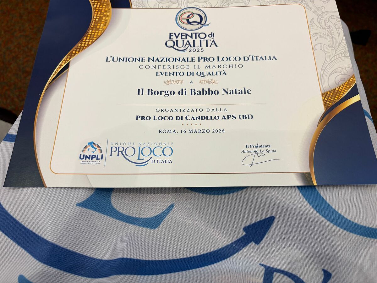 Il borgo di Babbo Natale, realizzato dalla Pro Loco di Candelo, è ufficialmente un “Evento di Qualità”. La consegna del riconoscimento è avvenuto all'Ergife Hotel, a Roma, nella giornata di domenica 15 marzo, nel corso della cerimonia dell'Unione Nazionale delle Pro Loco d'Italia che ha l'obiettivo di valorizzare le manifestazioni che custodiscono e promovuono le tradizioni e il patrimonio culturale delle regioni d'Italia.