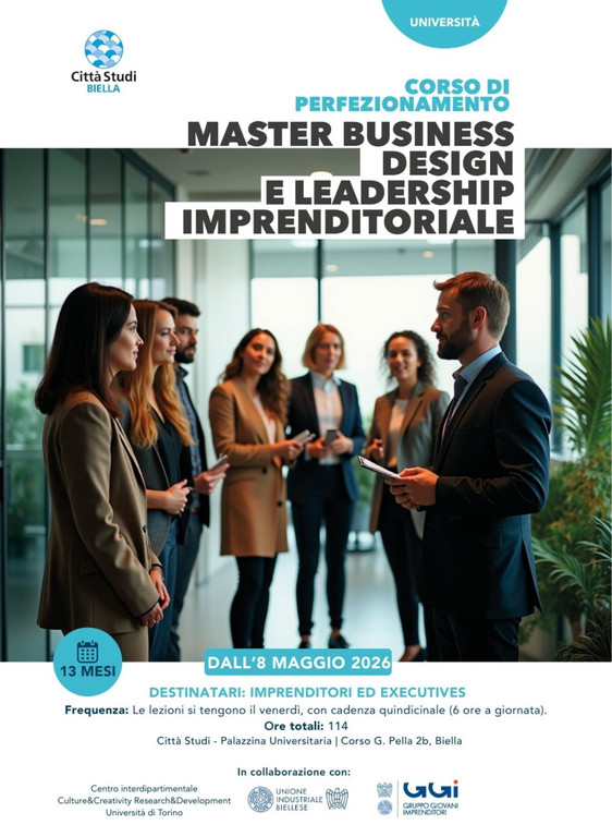 Città Studi Biella e l’Università di Torino presentano il nuovo Corso di perfezionamento “Master in Business Design e Leadership Imprenditoriale”, un percorso formativo in partenza l’8 maggio della durata di 13 mesi progettato per fornire a imprenditori, executive e manager gli strumenti necessari ad affrontare con visione e consapevolezza le trasformazioni che caratterizzano il mercato contemporaneo.