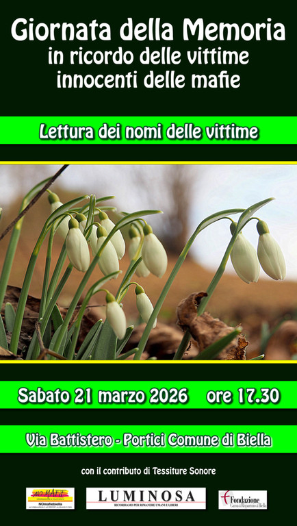 Anche NOmafiebiella parteciperà alla ricorrenza con un momento di commemorazione pubblica: domani, sabato 21 marzo 2026, alle ore 17.30, sotto i portici del Comune di Biella, di fronte al Battistero, si terrà la lettura dei nomi delle vittime.