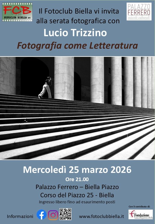 Fotoclub Biella mercoledì 25 marzo ha organizzato una serata speciale a Palazzo Ferrero Miscele Culturali dedicata alla fotografia e alle storie che si nascondono dietro ogni scatto. Ospite sarà Lucio Trizzino, fotografo che attraverso il suo lavoro riesce a trasformare la realtà in racconto visivo.