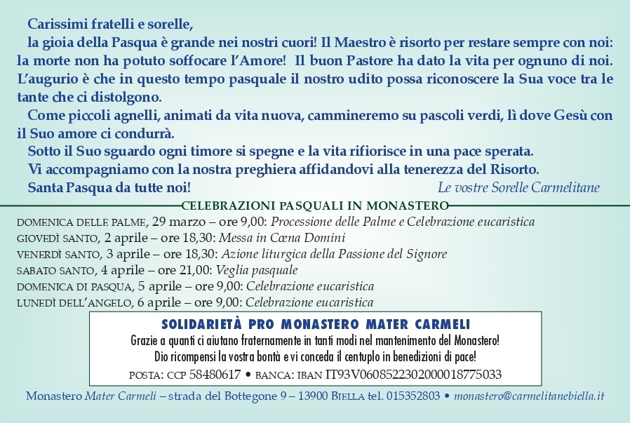 Un messaggio, quello delle religiose biellesi, che unisce spiritualità e comunità, rinnovando nel tempo pasquale un invito universale alla speranza, alla fede e alla pace.